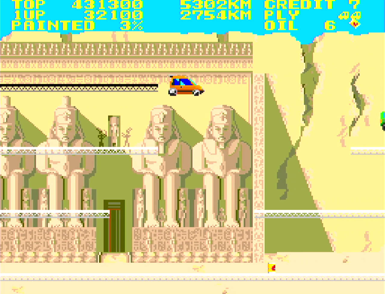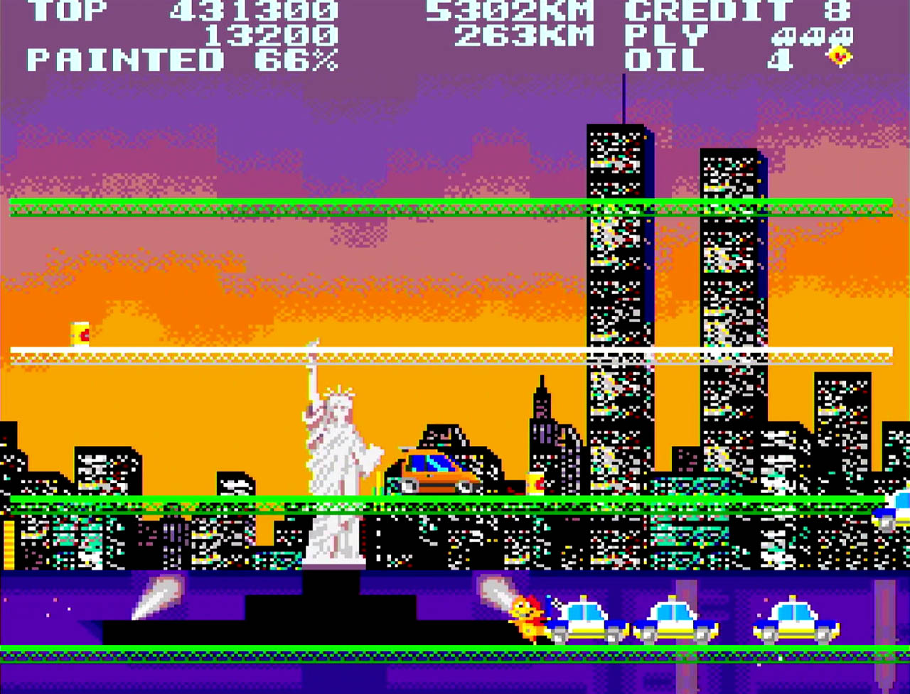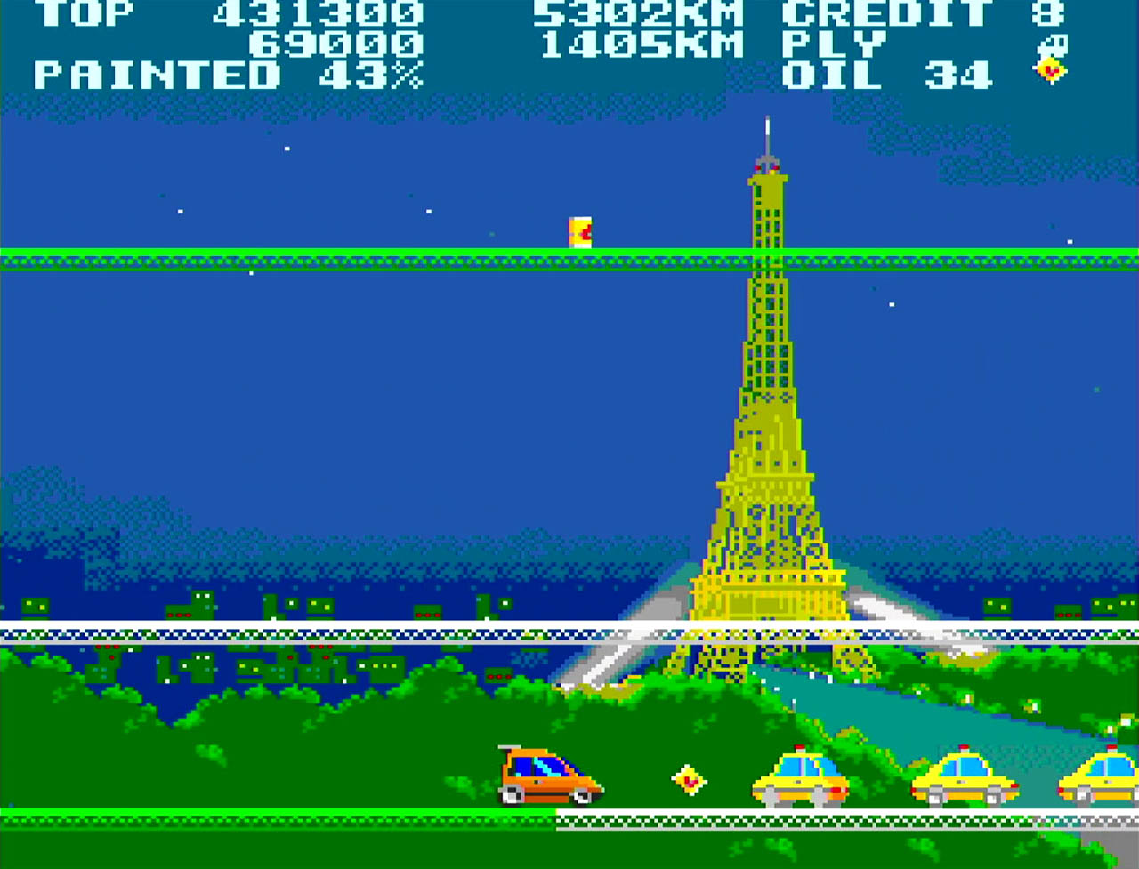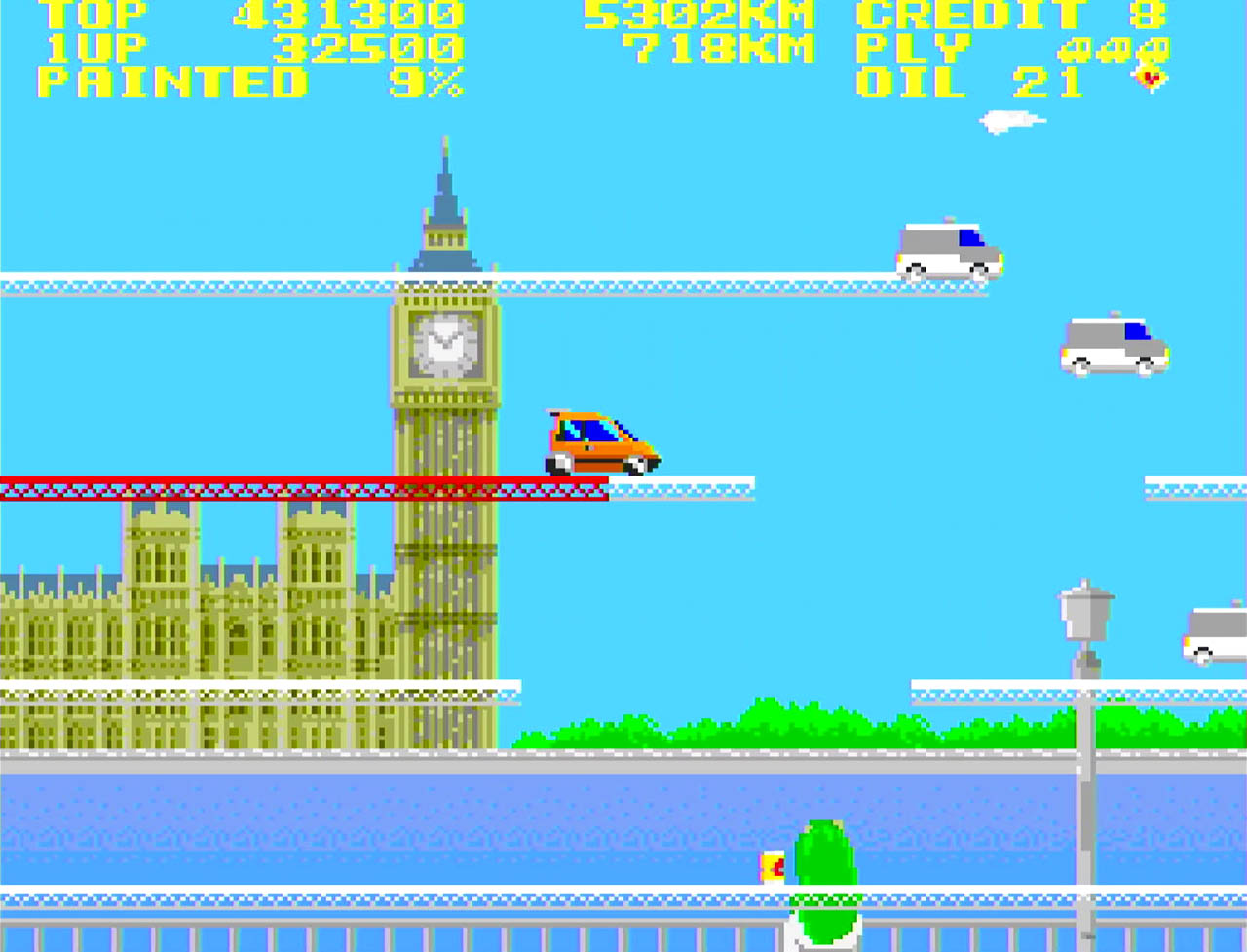 Each stage is themed after a well-known city or region, represented through distinctive background artwork. The challenge comes from avoiding enemy cars and the game’s infamous roaming cats, which can knock the player off platforms. Despite its simplicity, the Mega Drive version preserves the original structure faithfully, appealing mainly to fans of old-school arcade design.