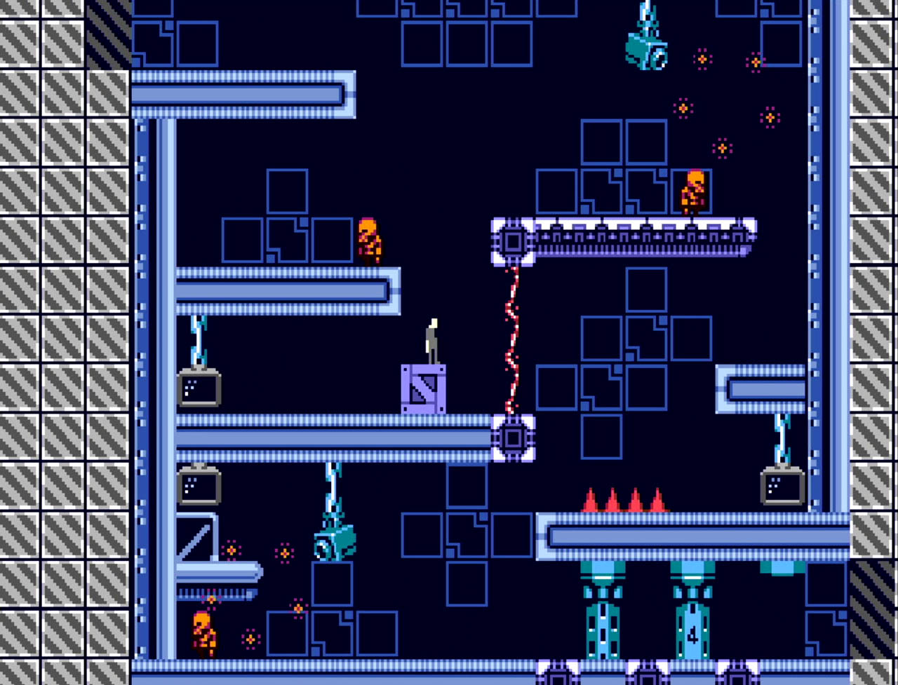 The first half of the game focuses on puzzle-platforming: avoiding robotic guards, navigating surveillance systems, and hacking computers by memorizing and repeating short button sequences. Later, the game introduces a series of distinct segments, including a short vertical shmup-style level focused on dodging obstacles, a rope descent sequence with its own mechanics, and a more traditional platforming finale. While the core gameplay is fairly standard, these shifts add variety to the overall experience.