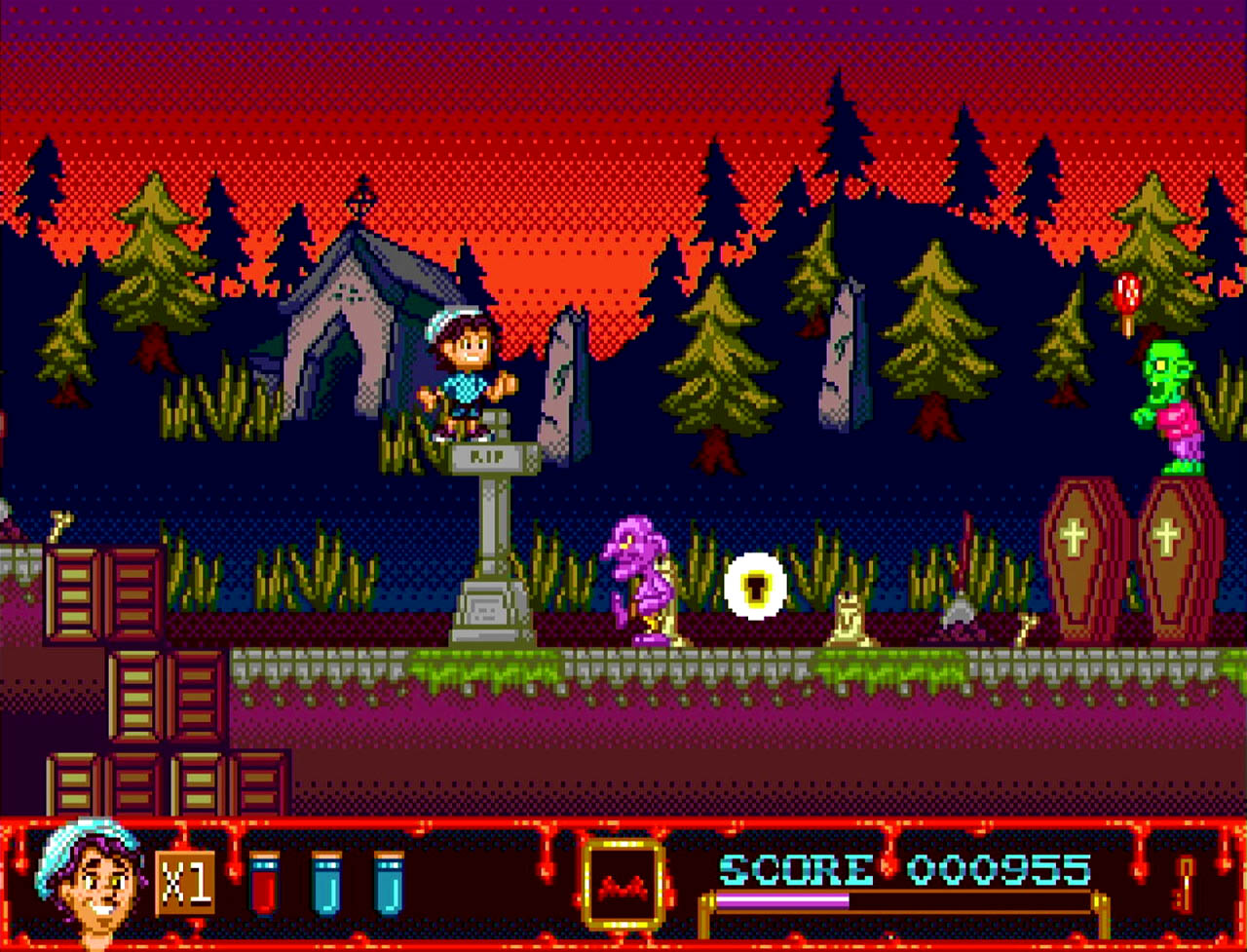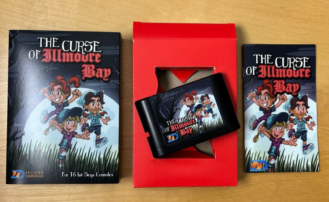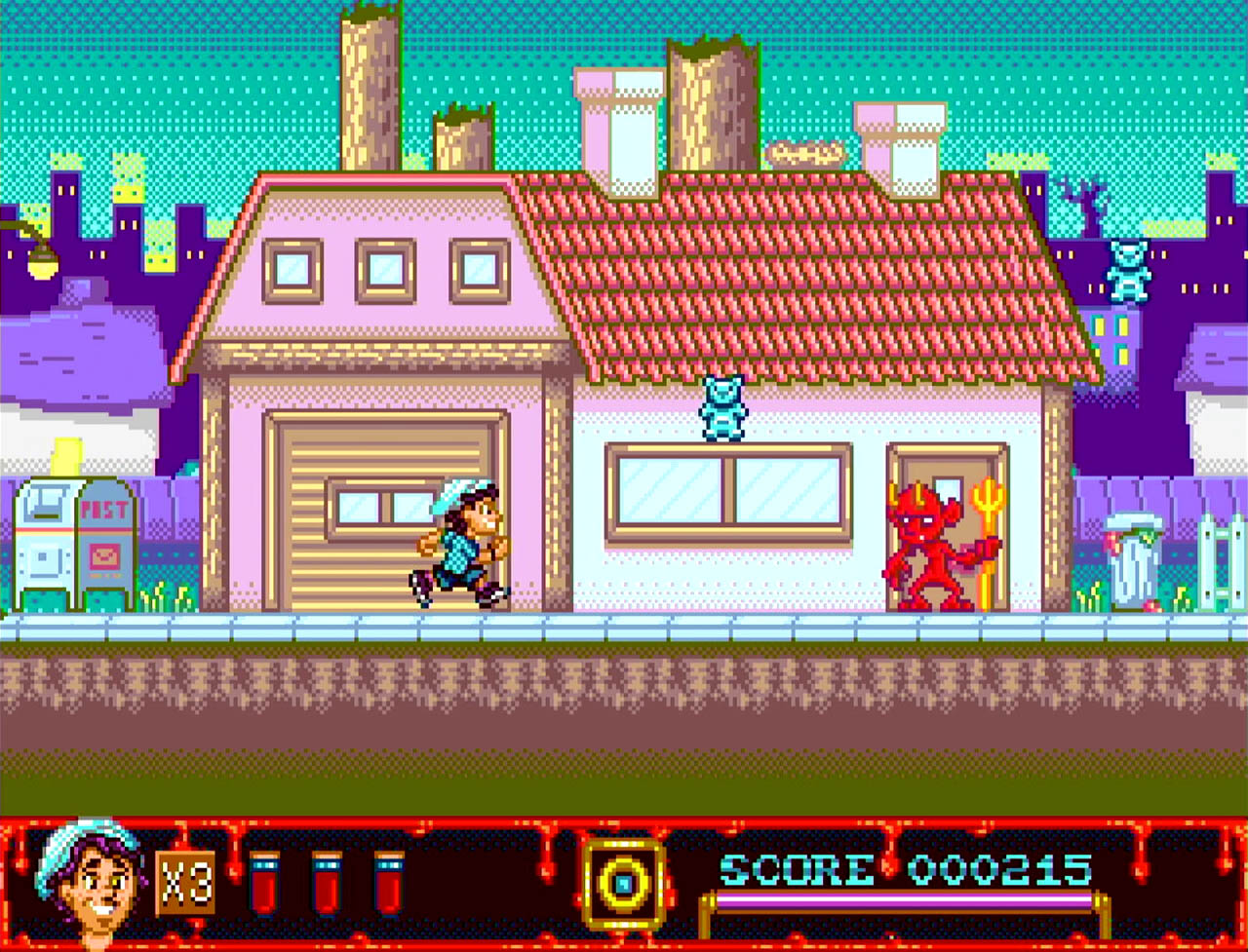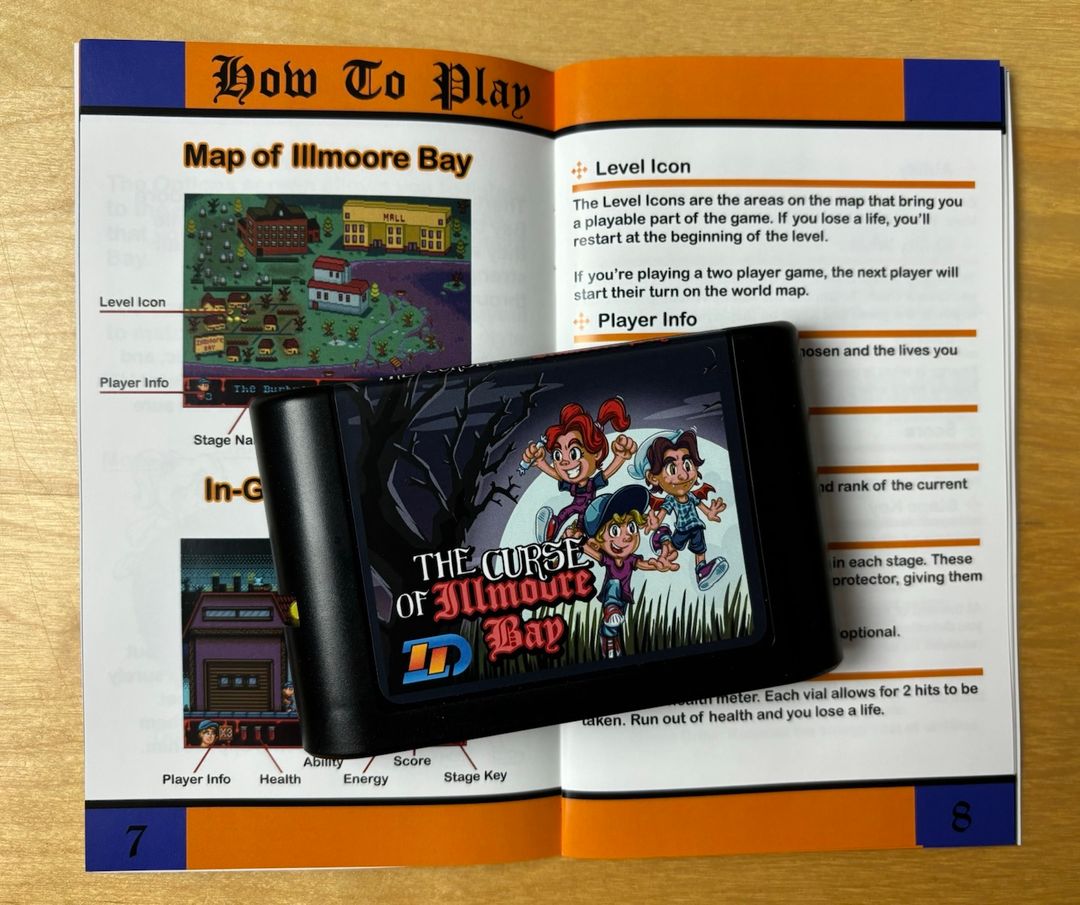 The Curse of Illmoore Bay is a story-driven action platformer for the Sega Mega Drive about three teenagers trying to save their small town from supernatural forces. The main antagonist hides inside a shopping mall, while the rest of the adventure takes place across a town overrun by zombies, ghosts, and other creatures. The premise strongly evokes classic 80s horror-comedy themes.