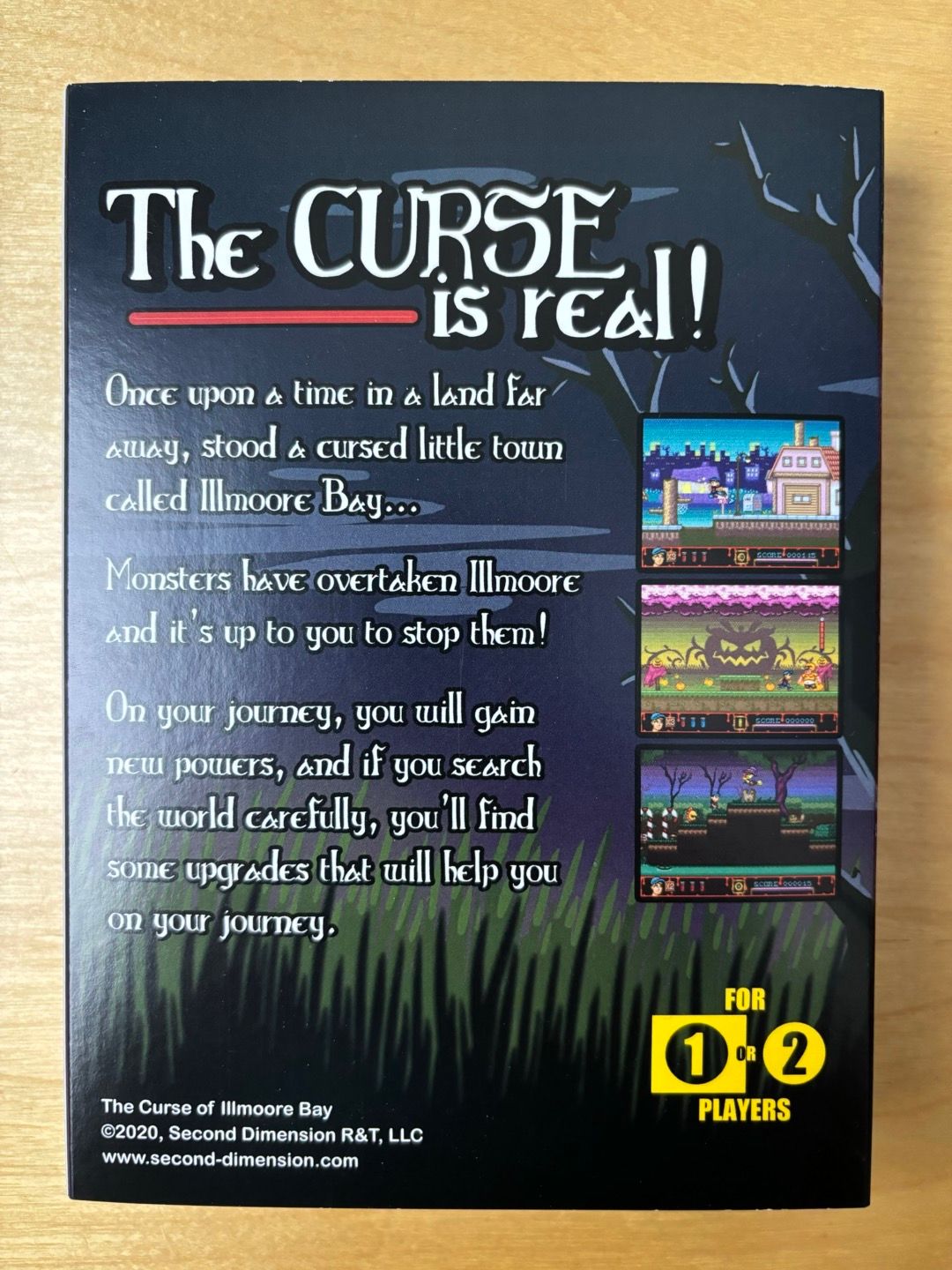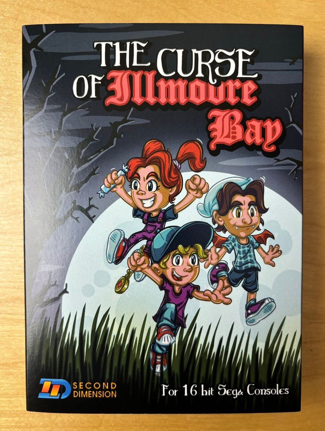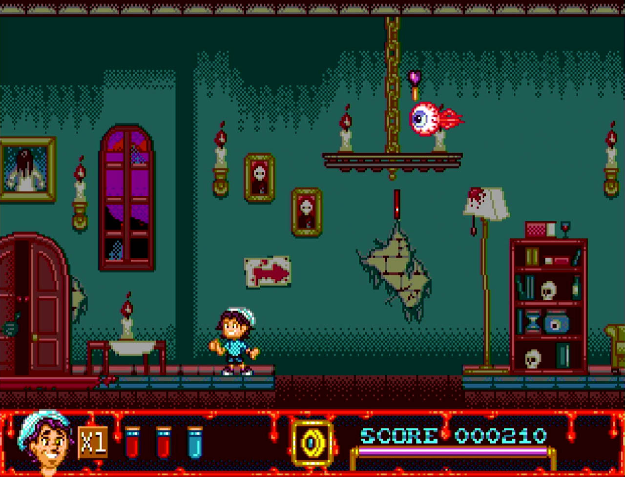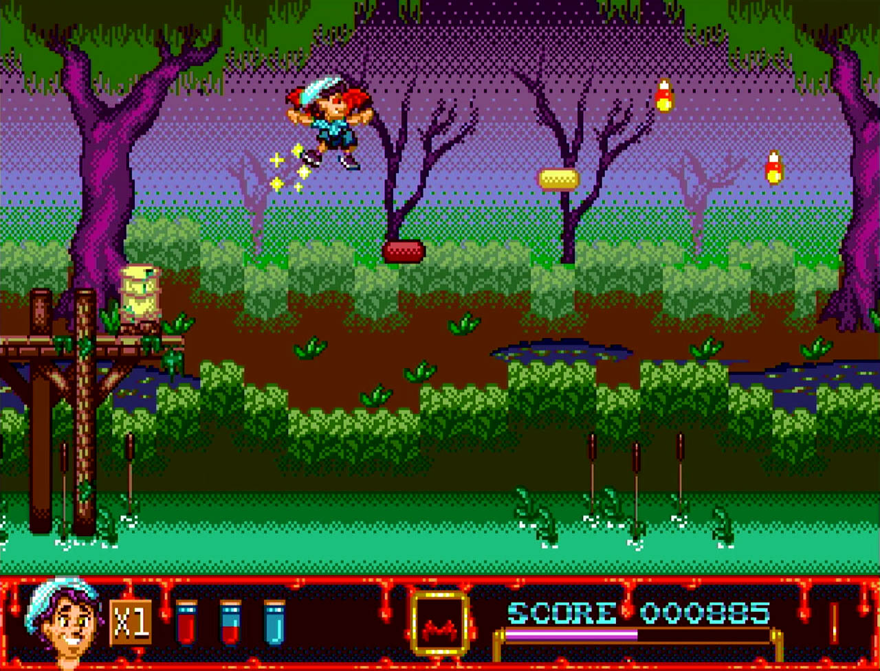 The Curse of Illmoore Bay is a story-driven action platformer for the Sega Mega Drive about three teenagers trying to save their small town from supernatural forces. The main antagonist hides inside a shopping mall, while the rest of the adventure takes place across a town overrun by zombies, ghosts, and other creatures. The premise strongly evokes classic 80s horror-comedy themes.