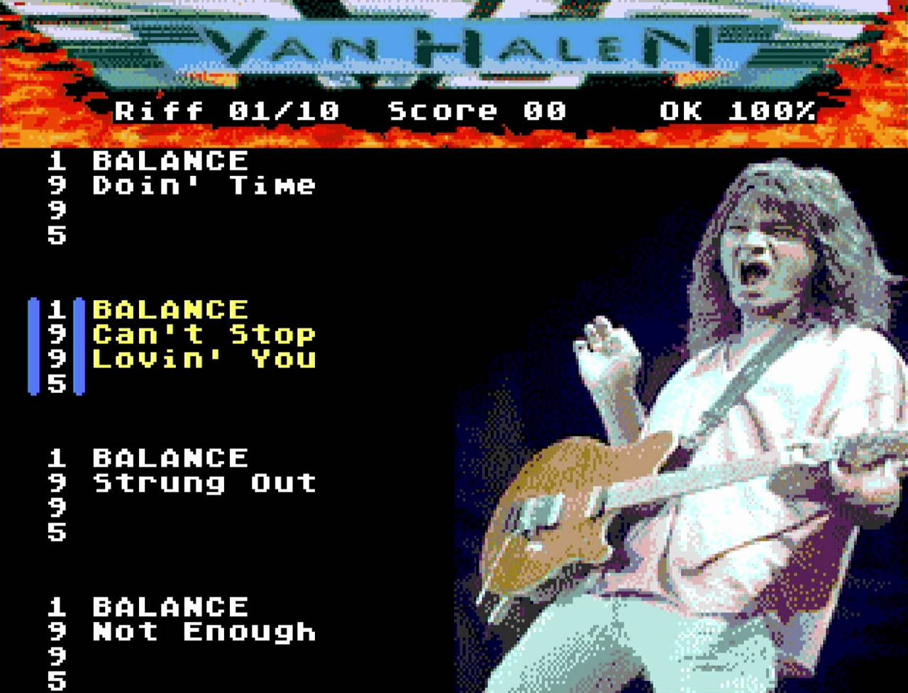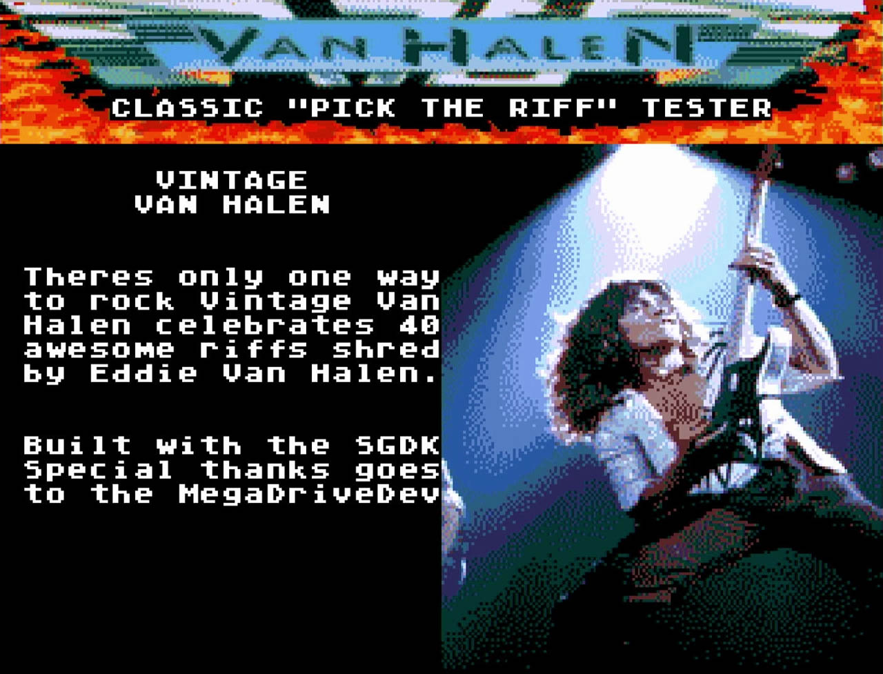 Vintage Van Halen is a music-based quiz game for the Sega Mega Drive developed by StevePro Studios, using the same engine as their Simpsons trivia title. This time the focus shifts to rock music, specifically the catalog of Van Halen, with the game built around recognizing iconic guitar riffs.
